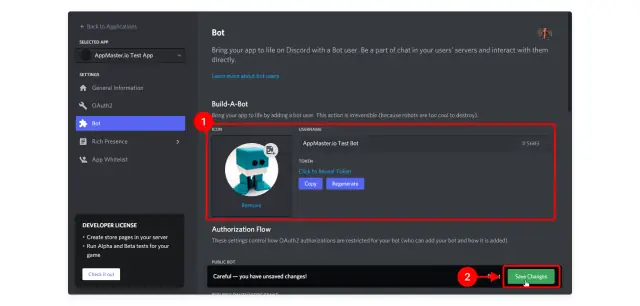 5. Le bot a été créé. Toutes les informations le concernant seront affichées dans l'onglet Bot. Ici, vous pouvez changer son nom, ajouter une image et copier le jeton du bot (1). Vous aurez besoin de ce jeton pour configurer le module Discord sur la plateforme Appmaster.io. Chaque fois que vous apportez des modifications, le portail développeur vous invite à les enregistrer (2).