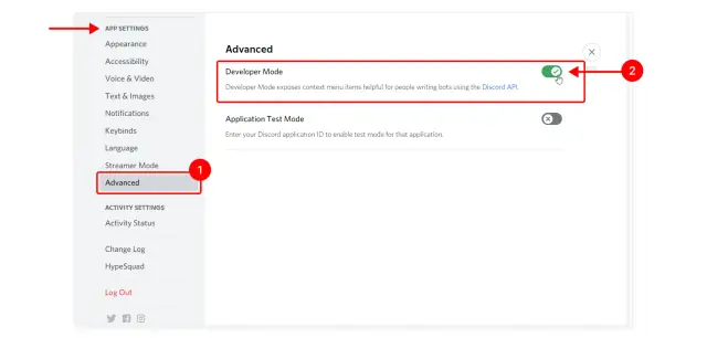 7. Allez dans la section PARAMÈTRES DE L'APPLI, dans l'onglet Avancé (1), et déplacez le sélecteur de mode développeur - le mode développeur est activé (2).