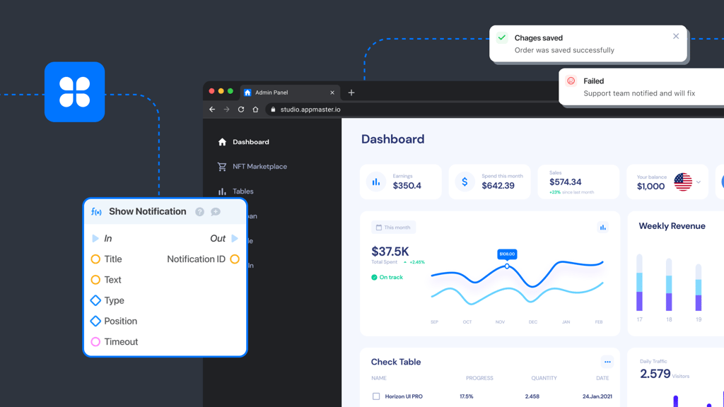 Blok Tampilkan Pemberitahuan bertanggung jawab untuk menampilkan pesan di aplikasi web AppMaster. Anda dapat menemukannya di editor BP frontend, di bawah Tindakan Aplikasi.