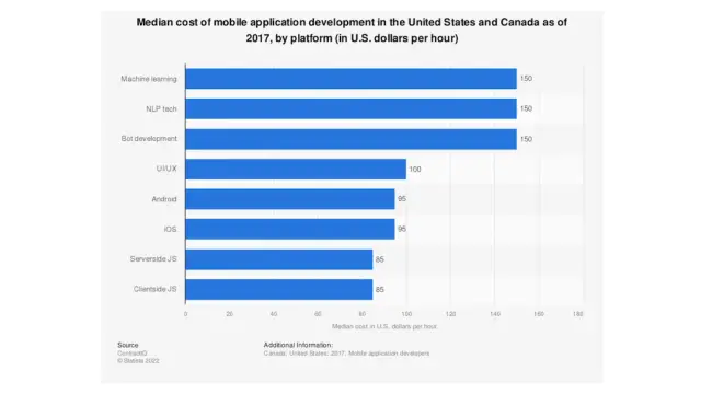 Anda dapat menerapkan beberapa tolok ukur standar atau rata-rata untuk biaya proyek pengembangan aplikasi ke berbagai kategori aplikasi. Dari data berbagai bisnis tentang biaya pengembangan aplikasi, Anda dapat memperkirakan biaya proyek Anda. Untuk proyek aplikasi standar yang membutuhkan waktu 500 jam untuk diproduksi, biayanya bisa mencapai $25.000 . Tentu saja, ada banyak faktor lain yang perlu dipertimbangkan saat menghitung biaya pengembangan aplikasi seluler.