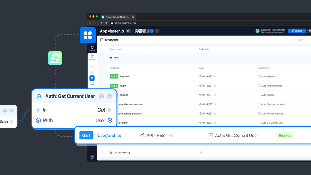 현재 사용자를 감지하기 위해 AppMaster에 Auth: Get Current User 블록이 있습니다. Auth 모듈에서 제공합니다. 왼쪽의 백엔드 탭에 있는 비즈니스 프로세스 편집기에서 찾을 수 있습니다.