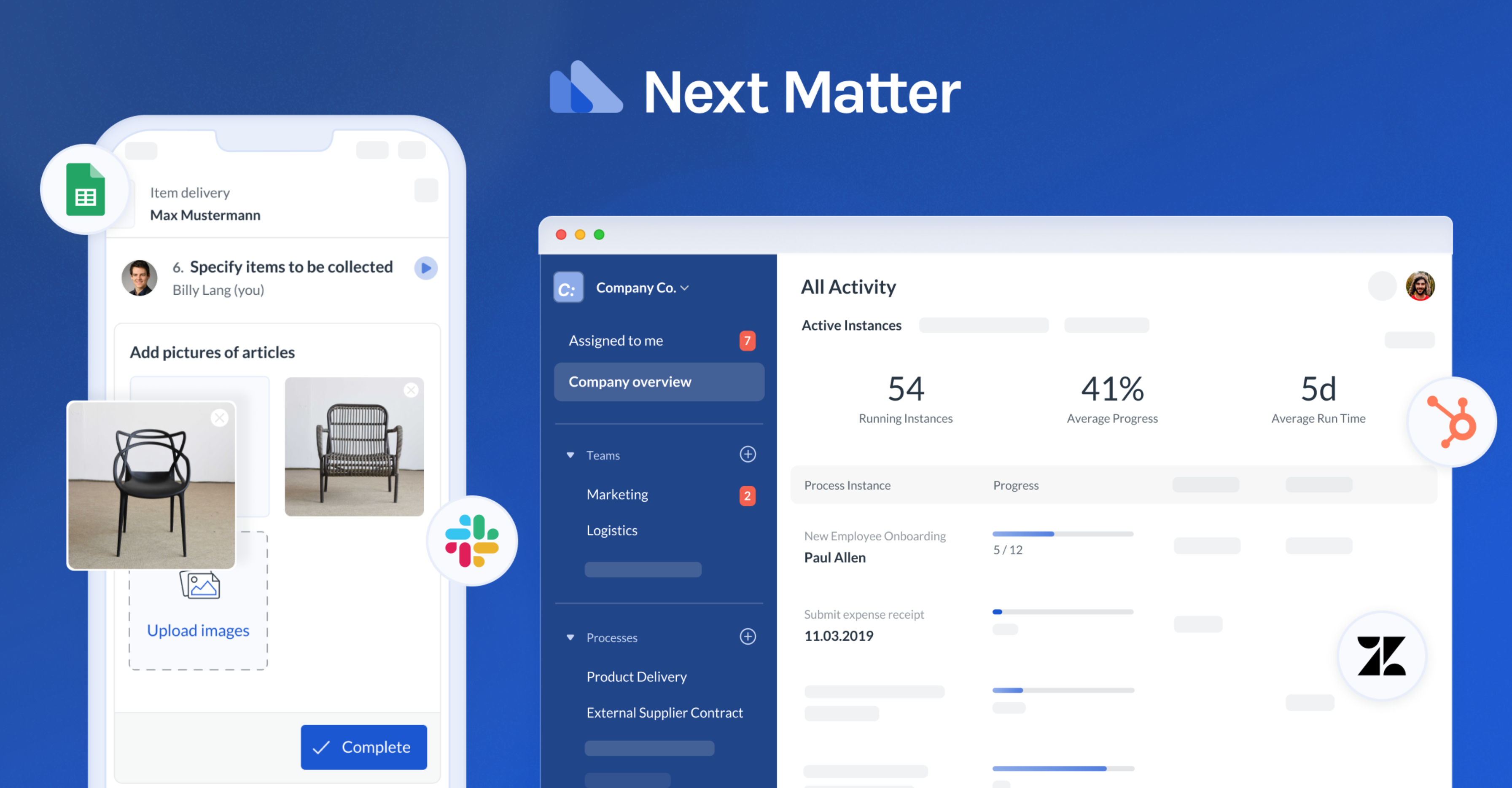 With Next Matter's mobile and web apps, users can drag and drop modules to create and automate workflows, forms, and processes either from scratch or using prebuilt templates. The platform allows for seamless integration with tools such as Google Sheets, Dropbox, Salesforce, HubSpot, Slack, and Zapier. Automation features enable users to send data to and from systems and trigger processes based on system events. Managers can access project and task tracking metrics, including speed and cost.