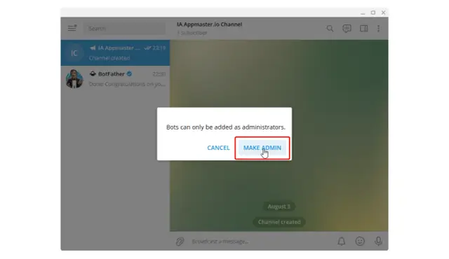Wyskakuje komunikat, że boty mogą być dodawane do kanałów tylko jako administratorzy. Zgódź się, aby bot stał się administratorem, klikając Make Admin.