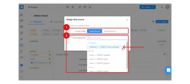 Podczas tworzenia formularza wybierz typ Create Record (1) oraz utworzony przez Ciebie endpoint (2).