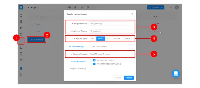 W zakładce Endpoints (1) dodaj nowy punkt końcowy (2). Wpisz nazwę i grupę, w której będzie wyświetlany (3). Ustaw typ żądania na POST (4). W polu Business Process wybierz utworzony właśnie proces biznesowy (5).