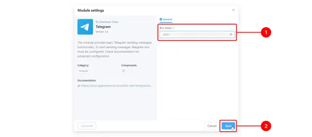 W ustawieniach modułu określ token swojego bota (1) i zapisz zmiany (2).