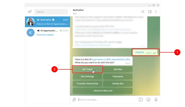 Token bota możesz znaleźć w BotFather: wpisz polecenie /mybots, aby uzyskać listę wszystkich Twoich botów (1) i wybierz ten, którego potrzebujesz. Pojawi się menu, wybierz w nim pozycję API token (2). BotFather wyśle Ci wiadomość z tokenem.