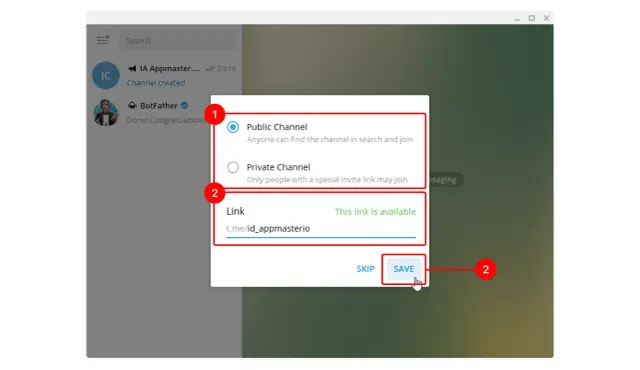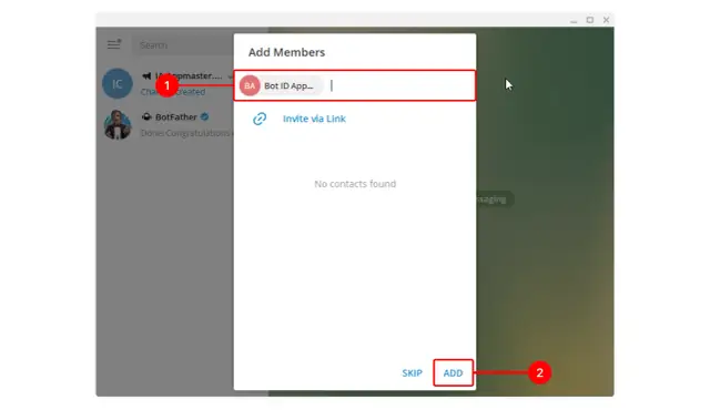 Zaraz po utworzeniu kanału Telegram zaproponuje dodanie do niego nowych użytkowników. Zacznij wpisywać nazwę użytkownika swojego bota - pojawi się ona w wyszukiwaniu (1). Kliknij na nią (2).