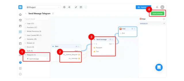 W procesie biznesowym umieść blok Send Message, który dodaje moduł Telegram (1). Zwróć uwagę, że w bloku Start musisz utworzyć dwie zmienne typu string (pierwsza to adres kanału, druga to tekst Twojej wiadomości) i połączyć je ze zmiennymi bloku Wyślij wiadomość (2,3). Jest to potrzebne do stworzenia formularza do wysyłania wiadomości. Nie zapomnij zapisać schematu (4).