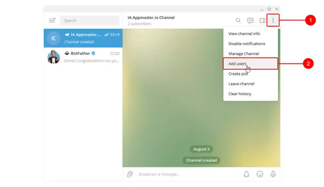 Możesz dodać bota po utworzeniu kanału. Aby dodać bota do już utworzonego kanału, otwórz ustawienia (1) i kliknij Dodaj użytkowników(2). Dalej - te same czynności, co w poprzednim punkcie.