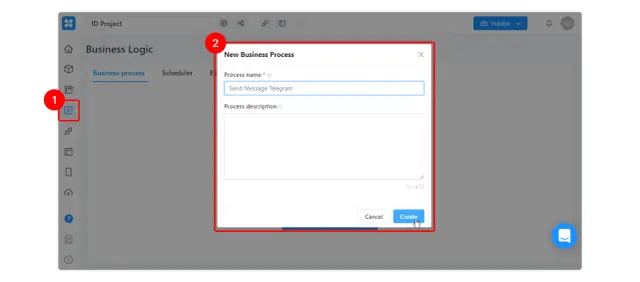 Przejdź do projektanta Business Logic(1) utwórz nowy proces biznesowy (2).