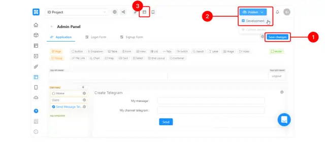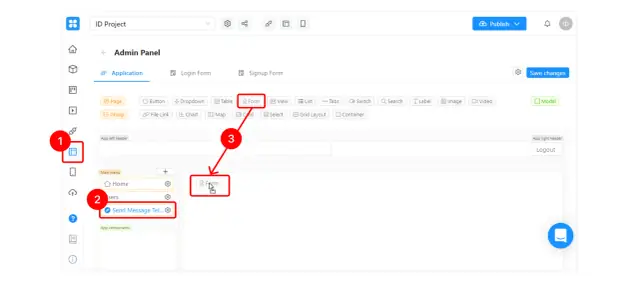 W projektancie Web Apps (1) otwórz swoją aplikację i przejdź do strony, z której użytkownicy będą wysyłać wiadomości do Telegrama (2). Utwórz w niej formularz do wysyłania wiadomości, przeciągając element Form na wybrany obszar strony (3).