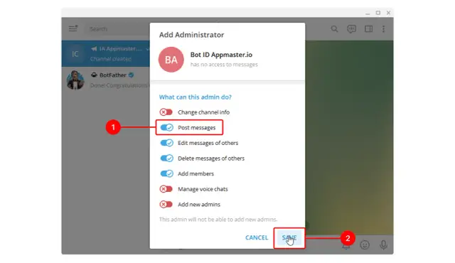 Teraz wybierz uprawnienia do zarządzania kanałami, które chcesz nadać swojemu botowi. Wybierz dowolne, ale pamiętaj, aby zezwolić botowi na wysyłanie wiadomości, włączając selektor Post messages (1). Kliknij Zapisz (2).