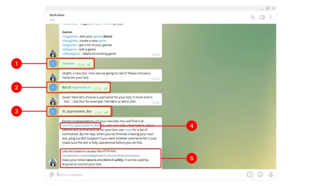 Bot został utworzony. BotFather poinformuje Cię o tym w wiadomości, wskaże nazwę użytkownika (4) oraz token autoryzacyjny (5).