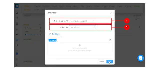 Otworzy się okno z ustawieniami. W polu Target component określ utworzony przez siebie formularz (1) i wybierz dla niego akcję Submit form (2).
