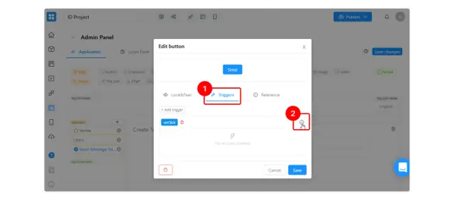 Na karcie Wyzwalacze(1) dodaj akcję dla wyzwalacza onClick- po kliknięciu (2).