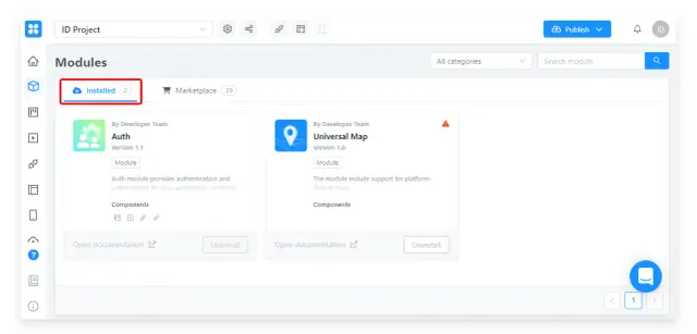 Wszystkie zainstalowane moduły znajdują się w zakładce Installed. Na przykład niektóre z nich, Auth i Universal Map są instalowane automatycznie, zaraz po utworzeniu projektu.