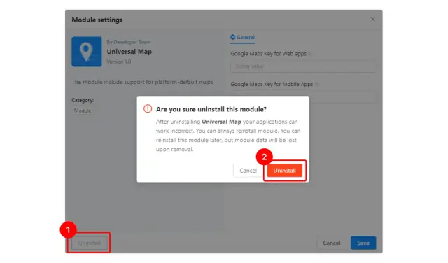 Aby odinstalować moduł, kliknij przycisk Odinstaluj na podglądzie lub w oknie ustawień (1) i potwierdź akcję w wyskakującym oknie (2).