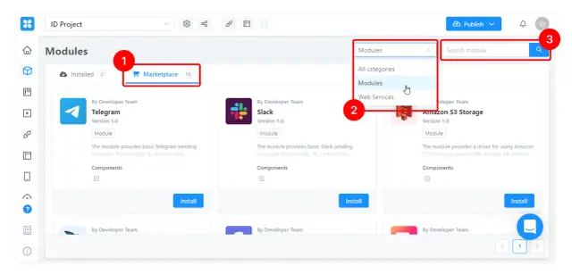 Wszystkie inne moduły dostępne do instalacji znajdują się w zakładce Marketplace (1). Tutaj możesz posortować komponenty według kategorii (2) lub znaleźć ten, którego potrzebujesz, według nazwy (3).