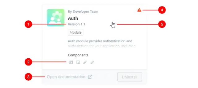 Podgląd wyświetla podstawowe informacje o module: aktualną wersję (1), ikony komponentów, które dodaje do aplikacji (2) oraz link do strony Documents z jego opisem (3). Jeśli zajdzie potrzeba skonfigurowania modułu (lub jest on skonfigurowany nieprawidłowo), w rogu pojawi się ikona ostrzeżenia (4). Aby otworzyć okno informacji i ustawień, kliknij raz na podglądzie (5).