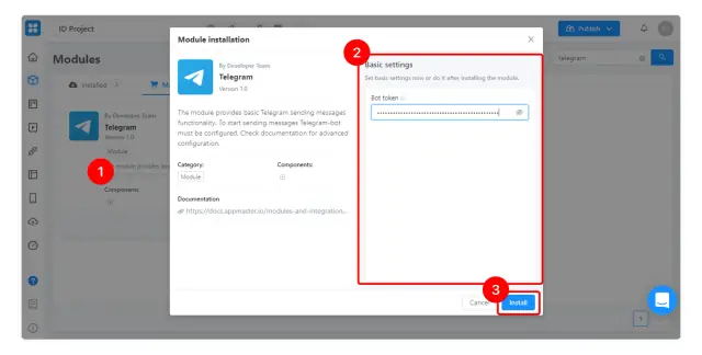Możesz też skonfigurować moduł przed instalacją: kliknij na niego (1), w otwartym oknie wypełnij wymagane pola (2) i kliknij Zainstaluj (3).