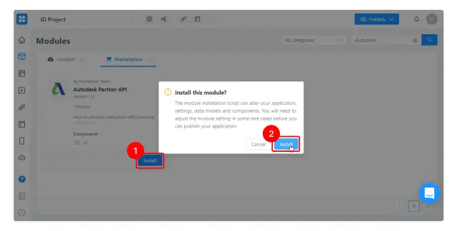 Kliknij przycisk Zainstaluj(1) i potwierdź akcję w wyskakującym oknie (2), aby zainstalować wybrany moduł. Po zainstalowaniu zostanie on przeniesiony do zakładki Zainstalowane.