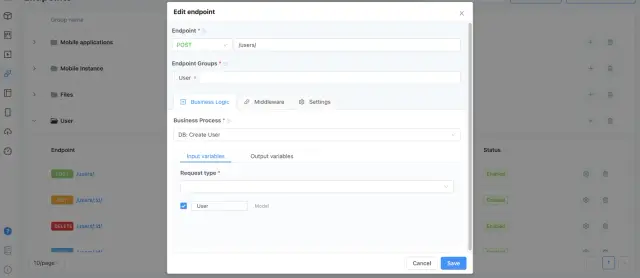 - Business Process. Один из важнейших параметров, который определяет, что будет делать эндпоинт. При этом сам эндпоинт может оставаться неизменным, он будет получать все те же запросы по старому адресу, но в случае замены бизнес-процесса, выполнять другую функцию. Для основных действий с базой данных автоматически создаются бизнес-процессы, которые нельзя отредактировать, но при необходимости можно заменить на пользовательские БП.