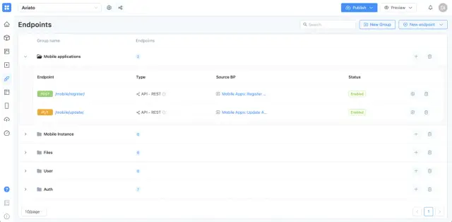 Все эндпоинты группируются. Внутри каждой группы вы найдете список соответствующих эндпоинтов, их типы запросов, URL-адреса и бизнес-процессы, к которым они подключены. Все эндпоинты можно удалять и редактировать.