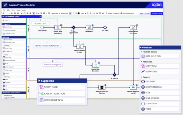 Appian также включает в себя возможности моделирования процессов — функцию, которая дает пользователям возможность проектировать и визуализировать сложные бизнес-процессы. С помощью моделирования процессов пользователи могут создать подробную модель процесса, выявляя потенциальные узкие места и области для улучшения. Этот инструмент может помочь предприятиям оптимизировать свою деятельность и повысить эффективность.
