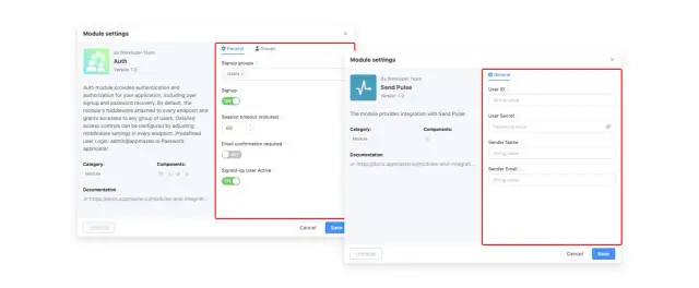 Модули Appmaster.io — это наборы настроек, которые помогают ускорить разработку. Подключая их, вы добавляете в приложение различные функции — авторизацию пользователя, редактирование изображений, шифрование данных, почтовые рассылки и многое другое. После этого вам останется минимально настроить новые компоненты — и они будут готовы к работе.