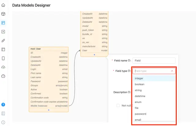 В AppMaster.io базам данных отведена гораздо большая роль. На платформе есть Data Models Designer, где можно создавать модели данных, работать с типами полей. При этом в AppMaster.io количество поддерживаемых типов полей намного больше, чем в Adalo. Помимо базовых типов, также поддерживаются: integer, boolean, string, enum, float, geo point и другие.