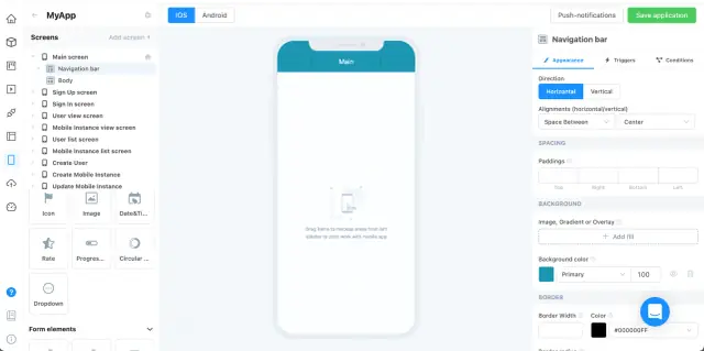 Все доступные элементы для работы с логикой расположены во вкладке Screens. По факту вы создаете пустой экран и добавляете на него нужные элементы: кнопки, иконки, списки, изображения. Все компоненты для удобства разделены на группы: Navigations, Lists, Buttons, Simple, Forms & Fields.