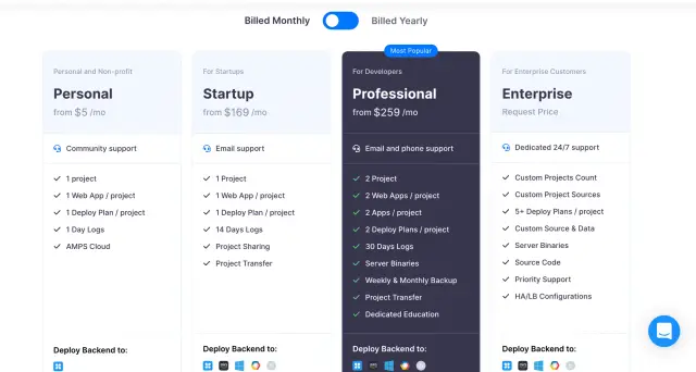 AppMaster.io: предлагает более гибкие условия, несмотря на то, что не является более дешевой опцией. Для организаций предусмотрен план с ценой по запросу. Также есть возможность докупить отдельные опции без смены текущего плана или собрать собственный план.