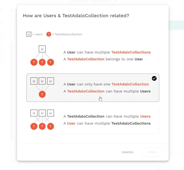 Между свойствами можно настраивать связи. В Adalo это стандартные связи БД: один-к-одному, один-ко-многим, многие-ко многим.