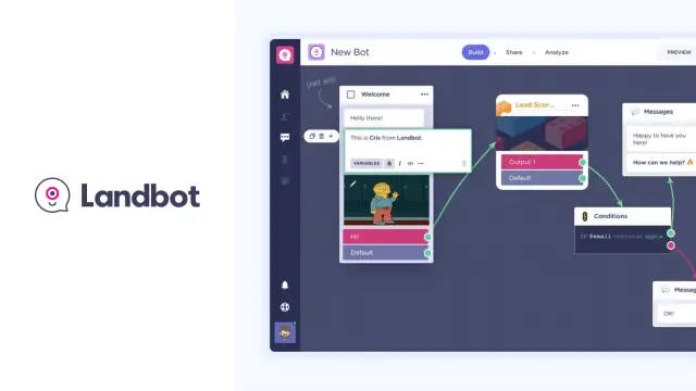 No-code платформа, которая помогает создавать чаты для вашей аудитории с помощью интуитивно понятного конструктора без кода, метода перетаскивания множественных элементов пользовательского интерфейса и многоканального взаимодействия в Интернете, мессенджера WhatsApp и FB. Landbot поддерживает расширенные рабочие процессы с данными, NLP, Dialogflow и интеграцию в реальном времени с другими ведущими приложениями. Оптимизирует каждый этап пути к покупке ваших клиентов от лидогенерации до клиентской поддержки без единой строчки кода.