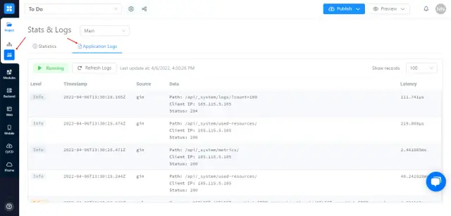Каждый проект AppMaster поддерживает стандартное логирование. Для работы с логами перейдите во вкладку Project / Deploy Stats. Здесь во вкладке Application Logs вы найдете все логи вашего приложения.
