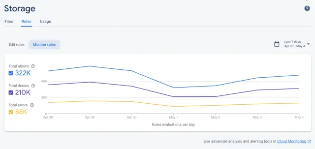 Firebase Güvenlik Kuralları, dosyalarınıza kimin erişebileceğini ve okuma, yazma ve silme gibi işlemleri gerçekleştirebileceğini belirler. Bu kurallar, her dosya veya dosya koleksiyonu için güvenlik düzeyini özelleştirmenize olanak tanıyan basit, esnek bir sözdizimi kullanılarak tanımlanır. Firebase Cloud Storage'da varsayılan olarak yalnızca kimliği doğrulanmış kullanıcıların dosyalara erişebilmesini sağlayan güvenlik kuralları vardır. Özel güvenlik kurallarını tanımlamak için şu adımları izleyin: