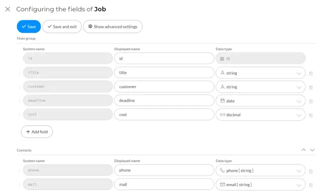 Directual, NoSql ilişkisel veritabanlarını kullanır. Directual'da bir veritabanı oluşturmak ve yapılandırmak kolaydır. "Yeni veri yapısı"na tıklayın ve bir klasör seçin. Klasörler de oluşturulabilir ("Yeni klasör" düğmesi). Ardından, ihtiyacınız olduğu kadar çok alanı doldurun. Alanları gruplara dağıtmak iyi bir uygulamadır. Örneğin, İşler tablosunda, "Kişiler" grubuna sipariş için iletişim bilgilerini koyabilirsiniz.