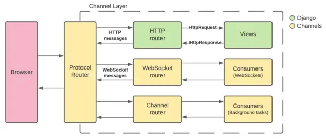 Django Kanalları, Django web uygulamaları için popüler bir WebSocket kütüphanesidir. WebSocket'lere özgü uzun ömürlü bağlantıları yönetmek için bir eşzamansız mod ekleyerek Django'yu WebSocket'leri ve diğer eşzamansız protokolleri zarif bir şekilde yönetecek şekilde genişletir. Django Kanalları, Django'nun varsayılan istek-yanıt modelini, WebSocket tabanlı uygulamalar için çok önemli bir özellik olan ölçeklenebilir, gerçek zamanlı eşzamanlılığa olanak tanıyan olay odaklı bir modelle değiştirir.