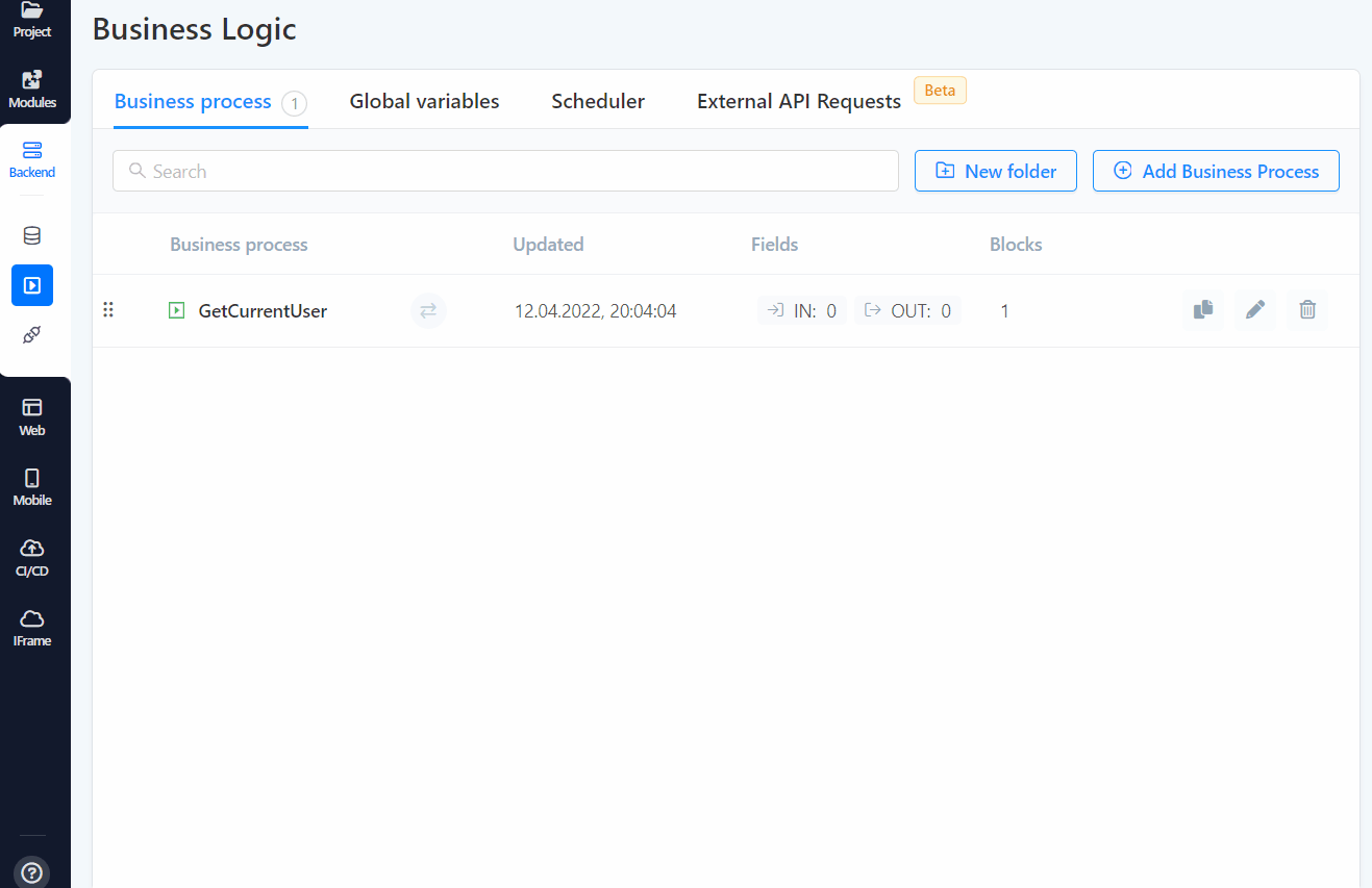 3. ไปที่แท็บ Web Apps และสร้างกระบวนการทางธุรกิจใหม่ด้วย Server request GET /user_current เพื่อรับผู้ใช้ปัจจุบันจากกระบวนการทางธุรกิจของเว็บแอปพลิเคชัน