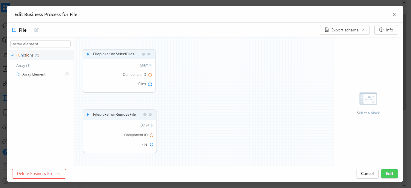 使用 onSelectfiles触发器。该触发器以数组形式接收文件,即使只有一个文件。因此,我们将使用 Array Element 块,从数组中获取一个元素。让我们把索引字段设置为0,从数组中获得第一个元素。