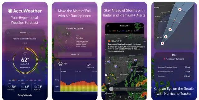 顾名思义,AccuWeather 提供天气警报,可在 iOS 和 Android 上使用。它是实时天气警报应用程序的最佳解决方案,因为大多数灾害都与天气有关。它以有关天气事件和一般天气相关信息的及时按钮推送通知而闻名。它是一个伟大的飓风、洪水和极端天气跟踪器。它显示未来一天或一周的预期温度,并提及是否会刮风、下雪或晴天。