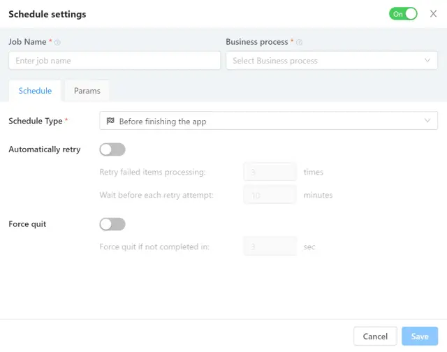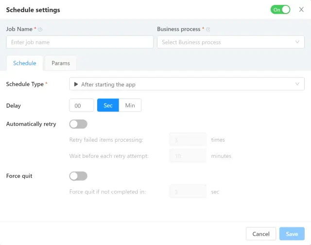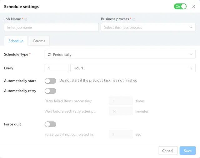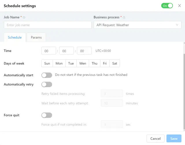 在调度器设置的Params选项卡中,当BP被调度器启动时,也可以向BP输入传递参数。