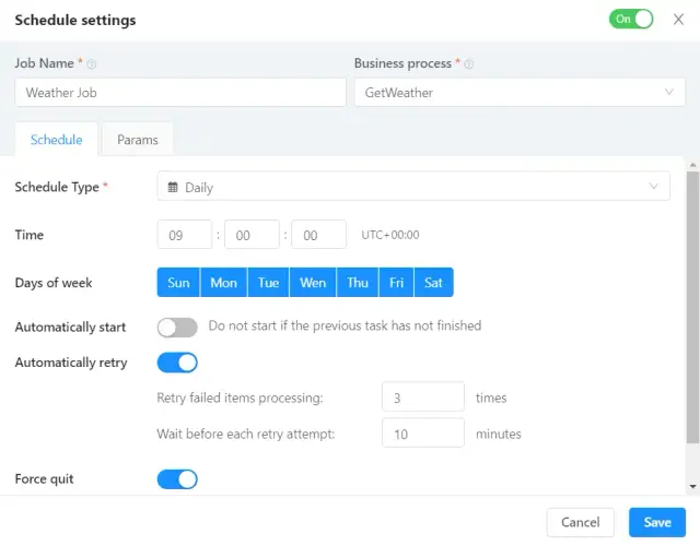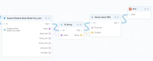 让我们考虑一个在AppMaster应用程序后台使用任务调度器的例子。假设你想建立一个进程,每天早上9点向用户发送天气信息到他的手机号码。