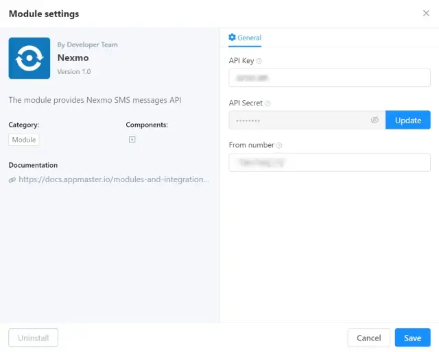 1.安装和配置发送移动信息的模块。Nexmo模块允许你在AppMaster应用程序中整合向选定号码发送短信的能力。