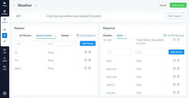 - 制作天气查询模型 - 创建一个虚拟的请求参数模型。Lon, lat - 所需地点的坐标,appid - OpenWeather服务的API密钥。