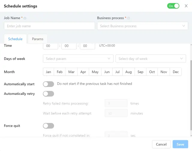 - 时间 - 定义调度器启动所选BP的UTC+0的时间。