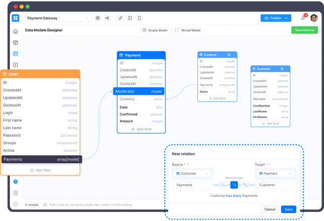 Create a schema, edit fields and relations, and manage foreign keys without writing SQL.