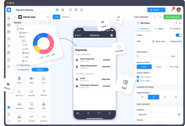 Build production-ready mobile applications with an intuitive drag-and-drop interface, publish them to App Store and Google Play. Also, track real-time every change you make.